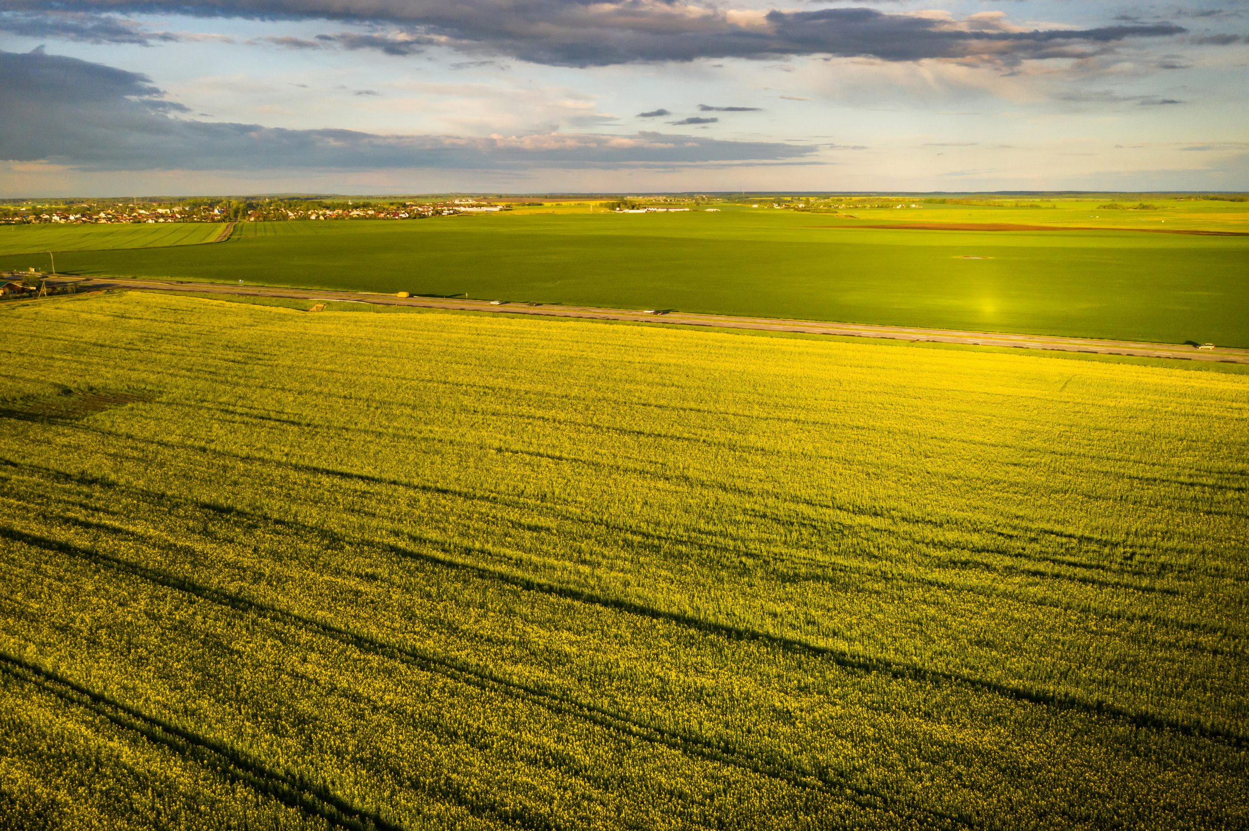 top view of a yellow rapeseed field after rain in Belarus, an agricultural area.The concept of development of the agricultural sector